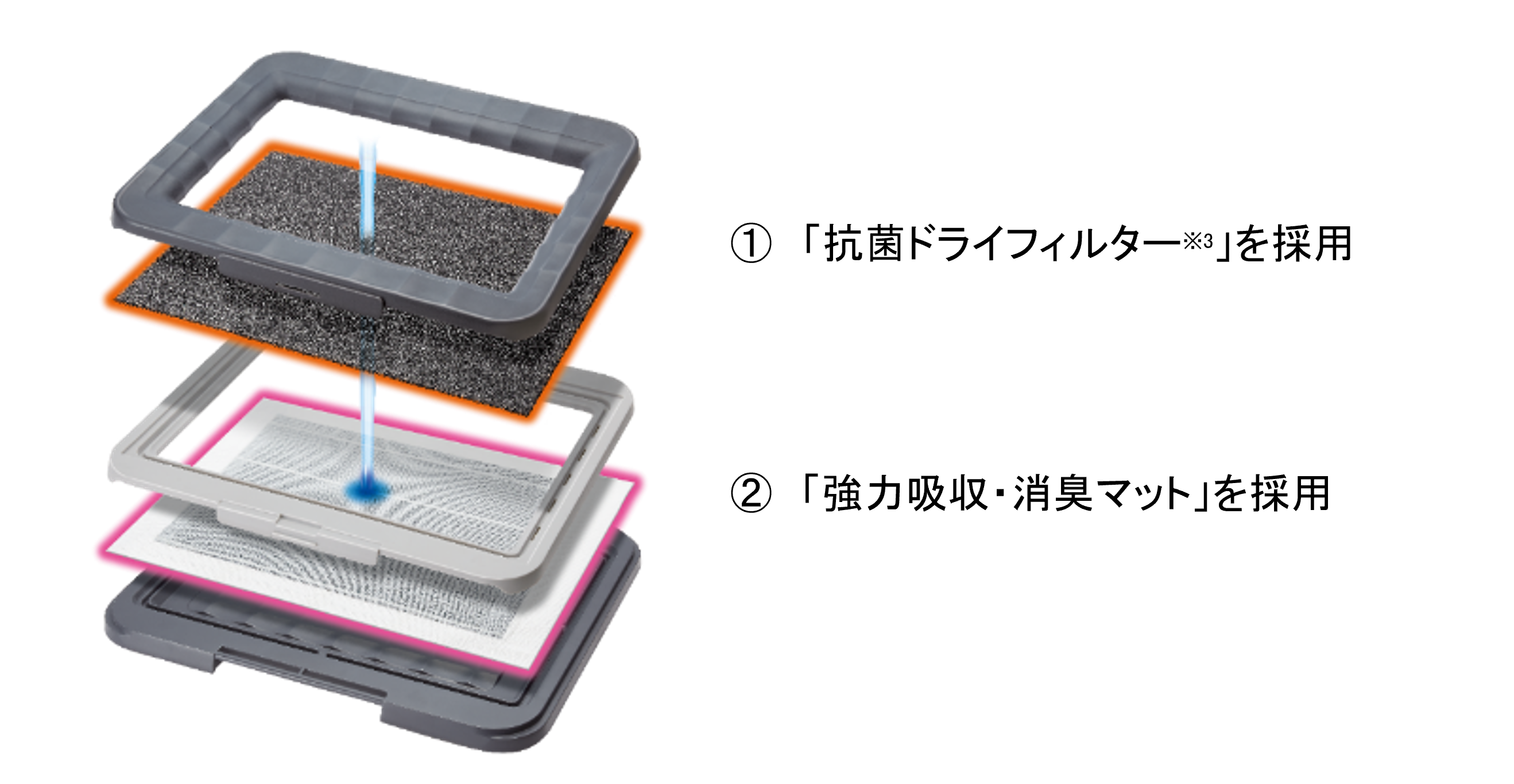 ② 強力吸収・消臭マット」採用で消臭効果が長時間持続します。