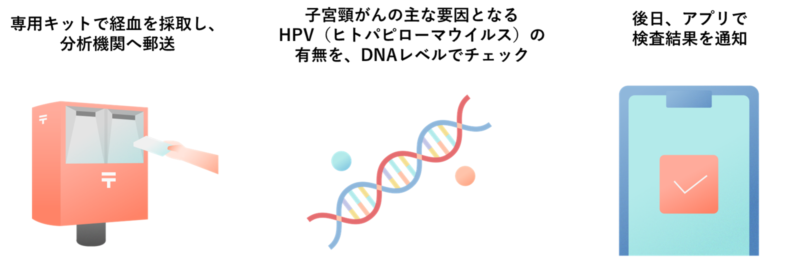 経血には血液以外にも子宮内膜細胞や膣分泌液などが含まれ、女性のコンディションやホルモンバランスの変化を映し出す“生体情報”が多く含まれています。本サービスでは、こうした経血由来の情報を活用し、現時点では子宮頸がんの主な原因とされるヒトパピローマウイルス(以下/HPV)に関する検査が可能です。