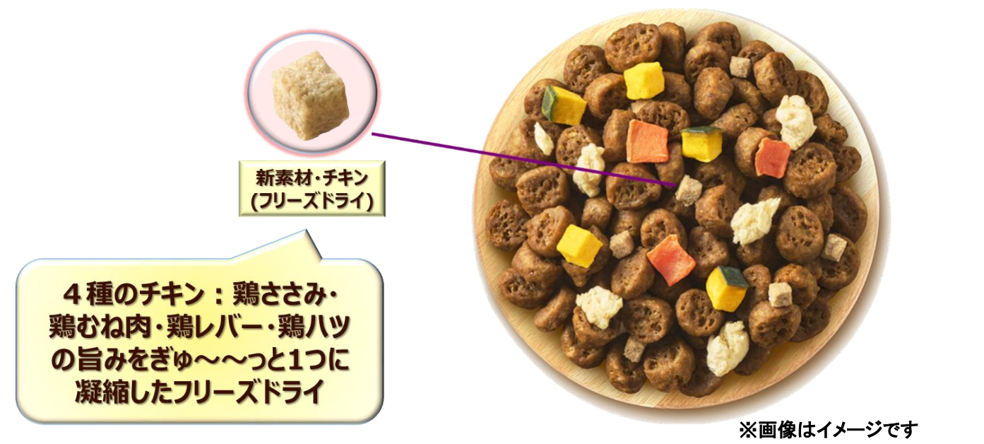 ・鶏ささみ、鶏むね肉、鶏レバー、鶏ハツ4種のチキン素材の旨みを凝縮したフリーズドライを採用しました。