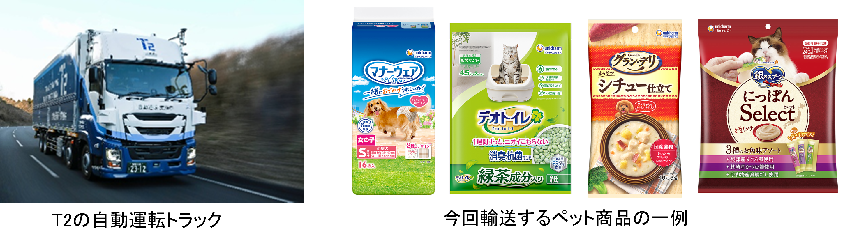 ユニ・チャーム株式会社(代表取締役 社長執行役員:高原 豪久)の生産子会社であるユニ・チャームプロダクツ株式会社、株式会社キユーソー流通システム(代表取締役社長:富田 仁一、以下「KRS」)および株式会社T2(代表取締役CEO:熊部 雅友、以下「T2」)の3社は、ユニ・チャームのペット商品を対象とした自動運転トラックによる幹線輸送の実証実験を、2026年4月2日より関東-関西間の高速道路の一部区間で開始したことをお知らせします。