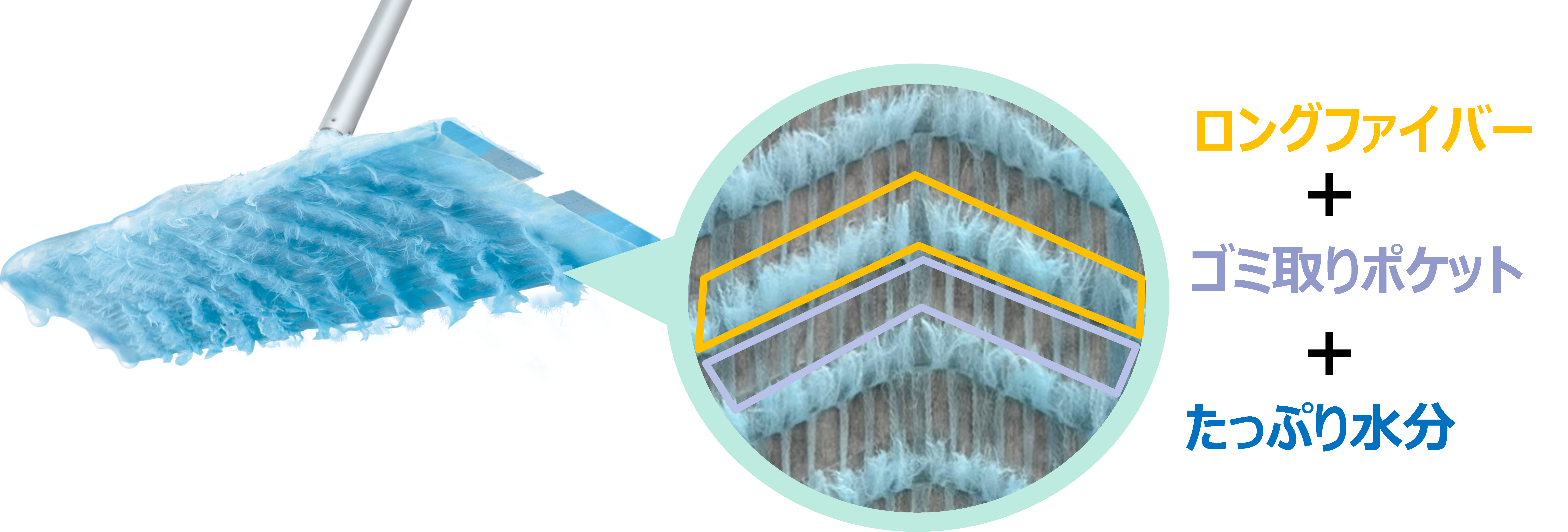 ・世界初※1の特許技術※2を採用した「ロングファイバー・ゴミ取りポケット」の起毛×水分たっぷりウェットシートにより、髪の毛や粒ゴミをしっかり絡めとりながら、ベタベタ汚れも拭き取ります。
