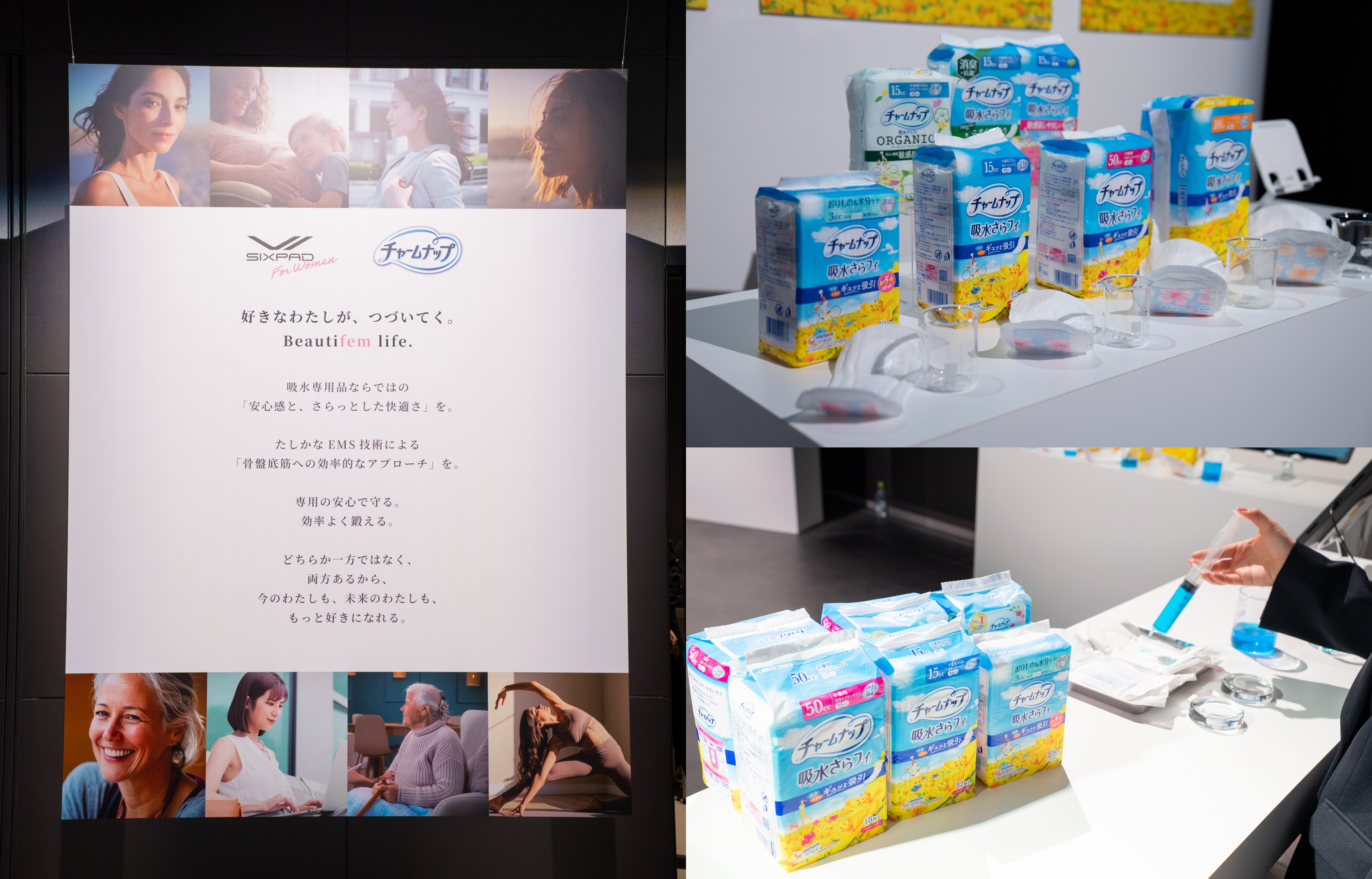 ユニ・チャーム株式会社(代表取締役 社長執行役員:高原 豪久)は、吸水ケアブランド『チャームナップ』と、株式会社MTG(代表取締役社長:松下 剛)が提供する、トータルウェルネスブランド『SIXPAD(シックスパッド)』と共同で、女性が自分らしく輝き続けられる社会の実現を目的とした「次世代フェムケアの新提案」を開始しました。本取り組みの一環として、2026年4月21日に開催された「SIXPAD for Women」新商品発表会において、両ブランドの知見を融合した体験型展示エリアを公開したことをお知らせします。