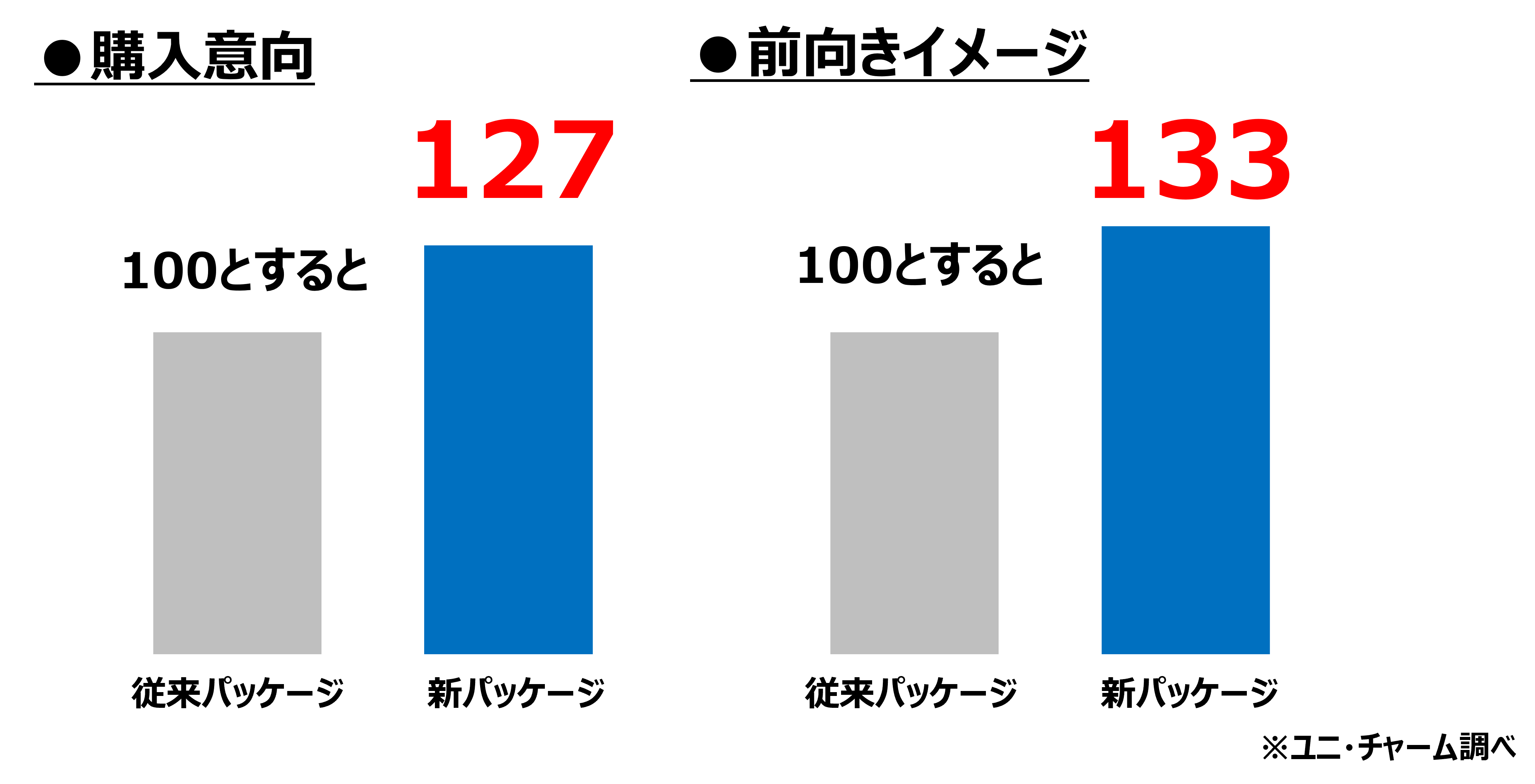 ・刷新したデザインは、明るく前向きな印象が評価され、従来のデザインと比較して購入意向が127%、前向きなイメージが133%に向上しています。
